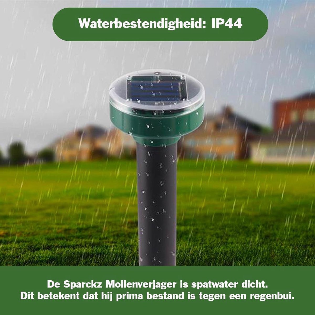 Hittebestendig materiaal: De Sparckz mollenverjager is gemaakt van polycarbonaat. Hierdoor bezit de verjager een uitstekende hittebestendigheid en kan hij prima tegen een stootje.